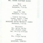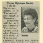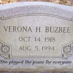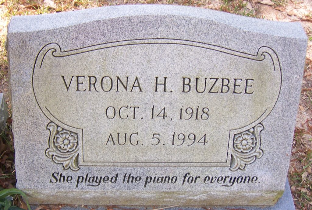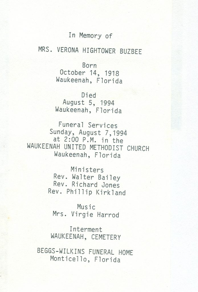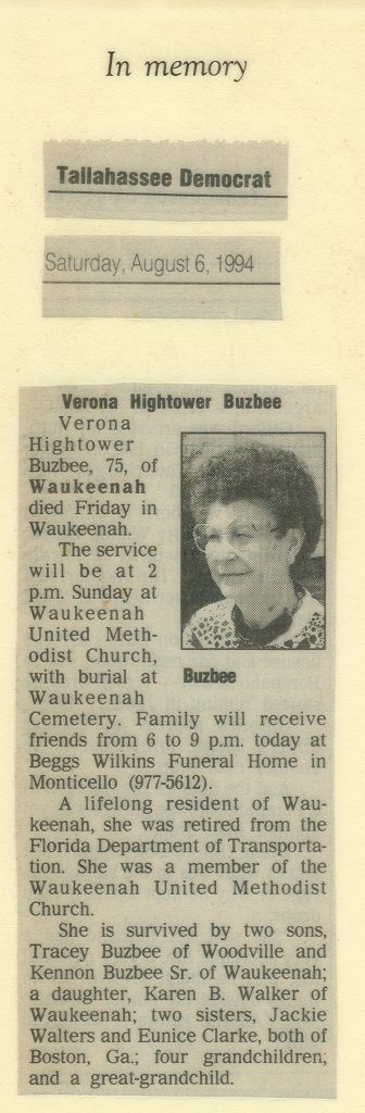 Wife of Lovell Buzbee. Daughter of R.L. & Orman Hightower. Mother of Tracey, Kennon, & Karen. Known for her talent of playing the piano by ear. Lived in Waukeenah her entire life. Born, lived entire life & died in same home. Can you imagine what she accumulated? She attented school in Waukeenah thru the 8th grade and then graduated from Monticello High School. She played the piano for everyone. Was very musically talented and could play many instruments. In her younger years, she and several ladies (Mattie Lou Monroe Roberts, Gertrude Grantham) of Waukeenah formed a Minstral playing for the locals. She would also play for the local square dances in the old Waukeenah School building while Mr. Joe Cooksey would do the calling. She and her lifelong friend, Lila Brown McClellan, probably climbed every tree in Waukeenah. They were some ball players and “tomboys”. She worked for Southeastern Telephone Company, Department of Highway Safety, and retired from the Florida Department of Transportation. She loved to sit on the front porch and wave at the locals who passed on US 27. In the 1950’s she and her son, Kennon ,were known for playing and singing on WCTV , Lowell McCormick’s Gospel Hour, as well as many all night sings around. They were very good and performed for many funerals and church services. She loved to visit nursing homes to play for the residents. Member of WUMC and play her entire life there for services and events.